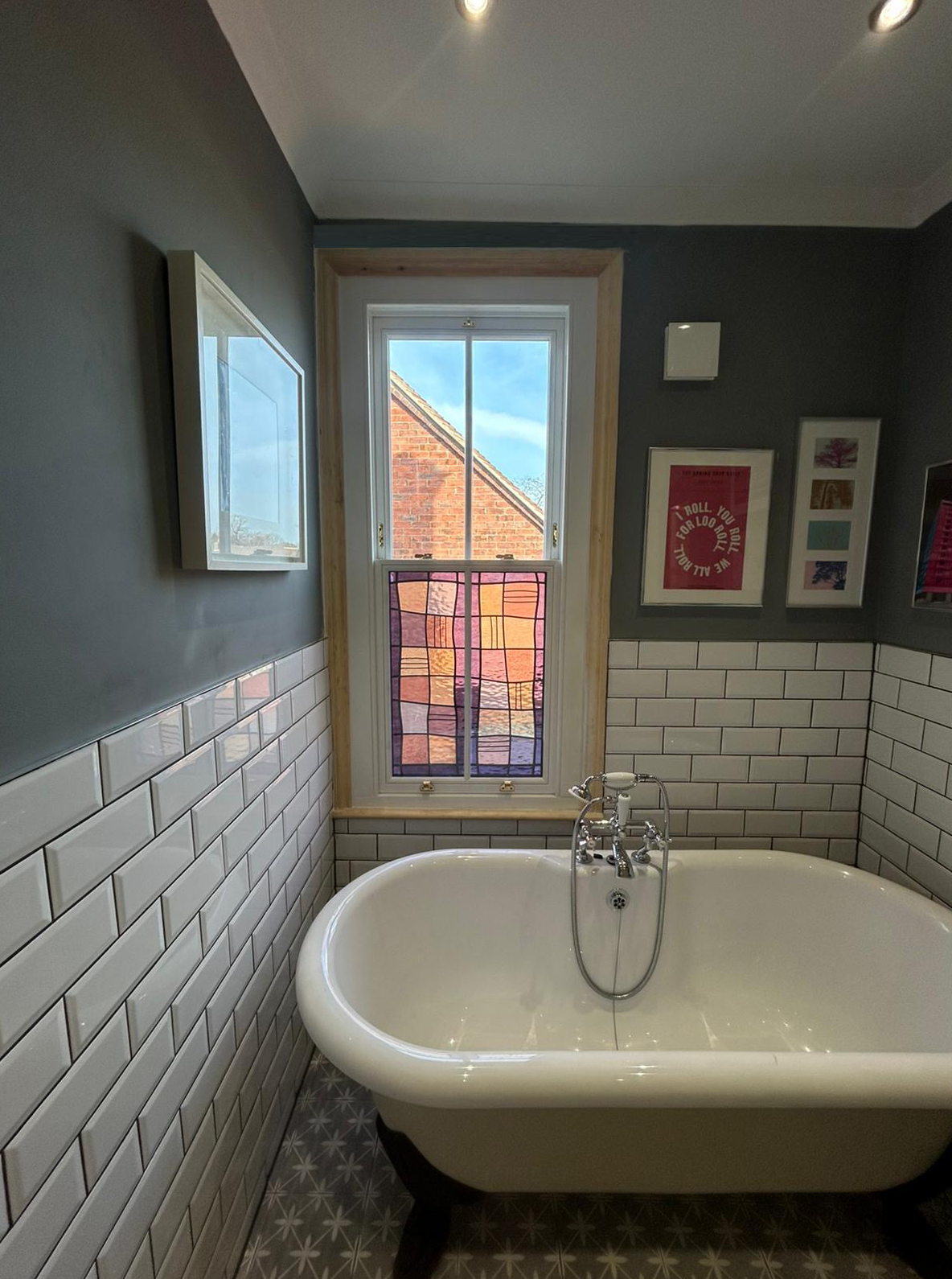 After removing an existing piece of very traditional stained glass from a round bathroom window, we commissioned Dave to make us a new one to complement our refurbished ensuite and link into the garden. We have never commissioned anything like this before, and Dave was absolutely brilliant with guiding us through the entire process. He was incredibly patient, and flexible working with us as our ideas for the window evolved. The finished piece exceeded our expectations, and compliments the room beautifully. It is certainly something which makes us smile whenever we enter the room, and we feel so proud that his piece of art work is a permanent fixture in our home, and will be for generations.